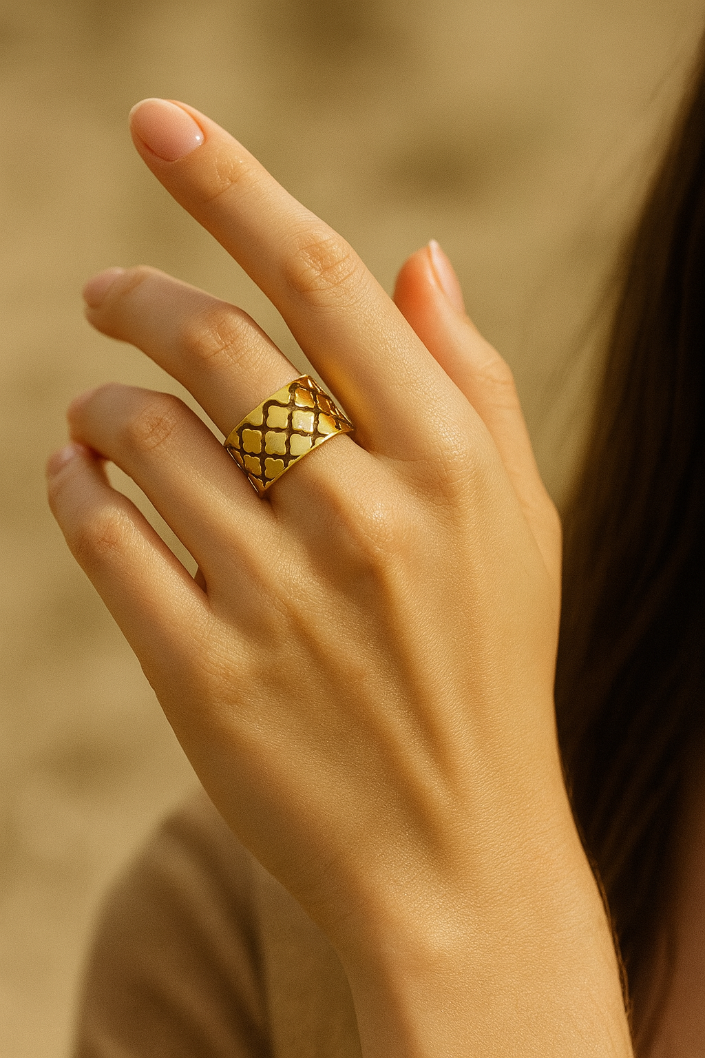 Add timeless elegance to your look with this wide gold stainless steel adjustable ring, featuring a modern geometric cut-out pattern. Its adjustable design ensures a perfect fit on any finger, making it a versatile piece for everyday wear or special occasions. Crafted with premium stainless steel, this ring is tarnish-free, durable, and comfortable, designed to shine beautifully for years. Whether worn alone for a bold statement or paired with other rings for a layered style, it’s a must-have accessory for your jewelry collection.